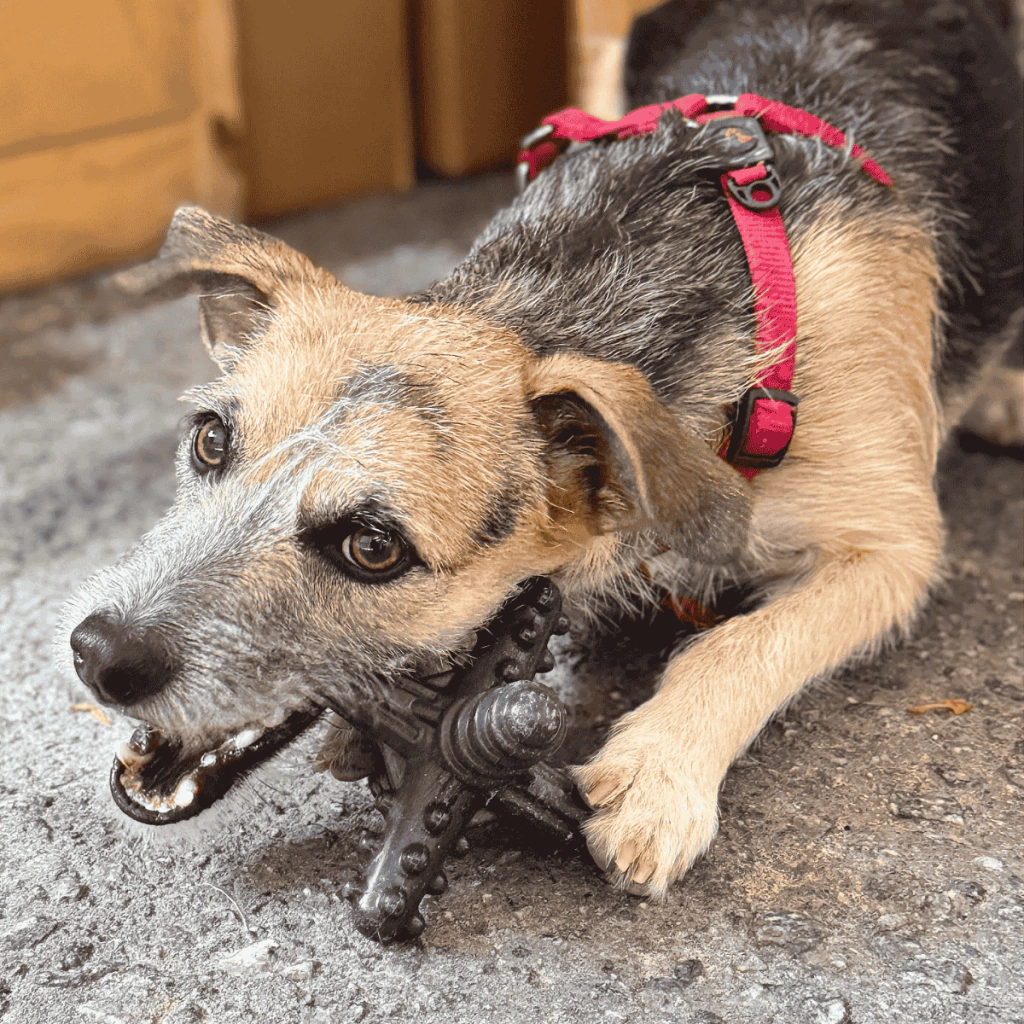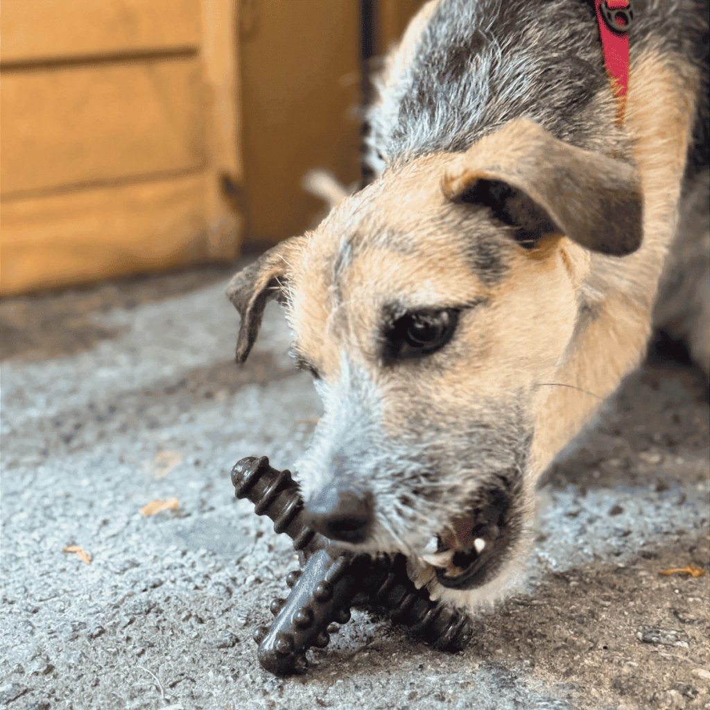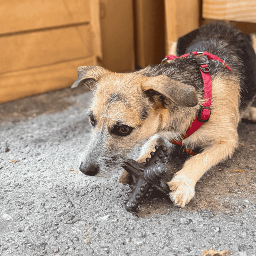 Seu formato em asterisco com várias texturas oferece estímulo por todos os lados, ativando o instinto natural de mastigação e promovendo saúde bucal de forma divertida e segura.