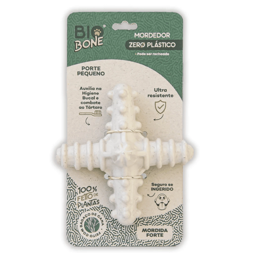 O Biobone Asterisco – Mordida Forte foi desenvolvido para cães de porte pequeno a médio, com mordida forte, que buscam um brinquedo com textura agradável: nem duro demais, nem mole demais. Seu design em formato de asterisco oferece diversão em todas as direções, estimulando o instinto natural de mastigação.