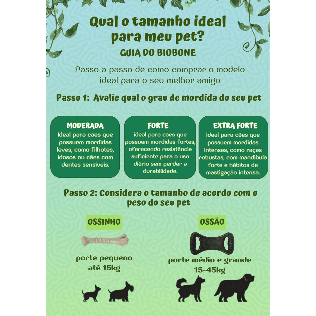 O Biobone Ossão Grande – Mordida Moderada é ideal para cães de porte médio a grande, com mordida moderada. É perfeito para perfis que gostam de roer, mas não são destrutivos, ou que não se adaptam a brinquedos muito duros.