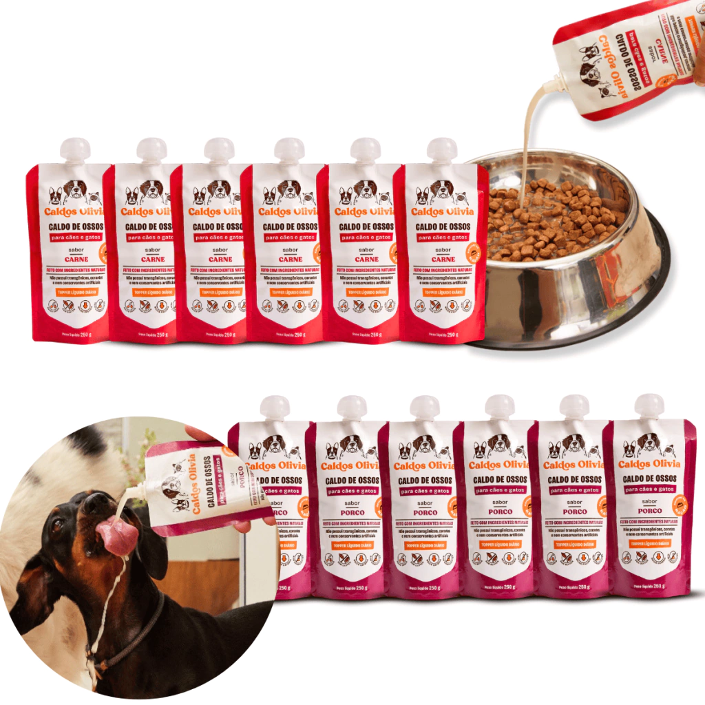 O Kit Misto Caldos Olivia (2 unidades) é a escolha perfeita para quem quer oferecer variedade e nutrição ao seu pet. Composto por 1 unidade do caldo sabor Carne (bovina) e 1 unidade sabor Porco (suíno), esse kit une sabor e saúde em porções práticas e seguras para cães e gatos de todas as idades.