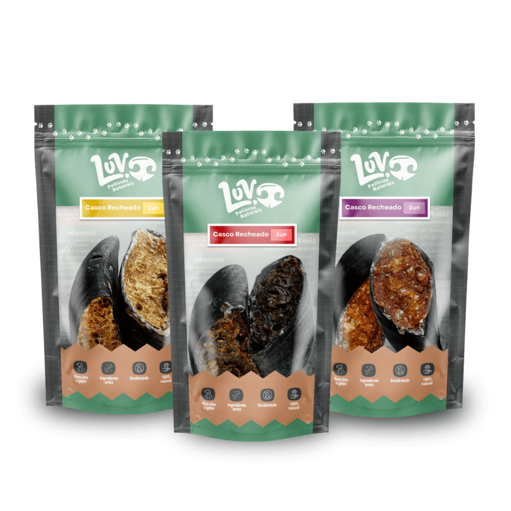 Feitos artesanalmente com casco bovino desidratado e recheios naturais, esses mordedores combinam resistência, sabor e estímulo mental em um só produto — ideal para cães de todos os portes.