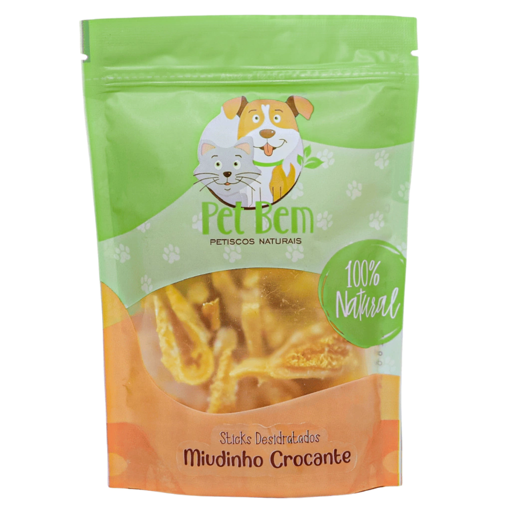 5) Petisco Natural Miudinho Crocante 60g Pet Bem – Rúmen bovino desidratado, crocante e nutritivo, perfeito para treinos e agrados.