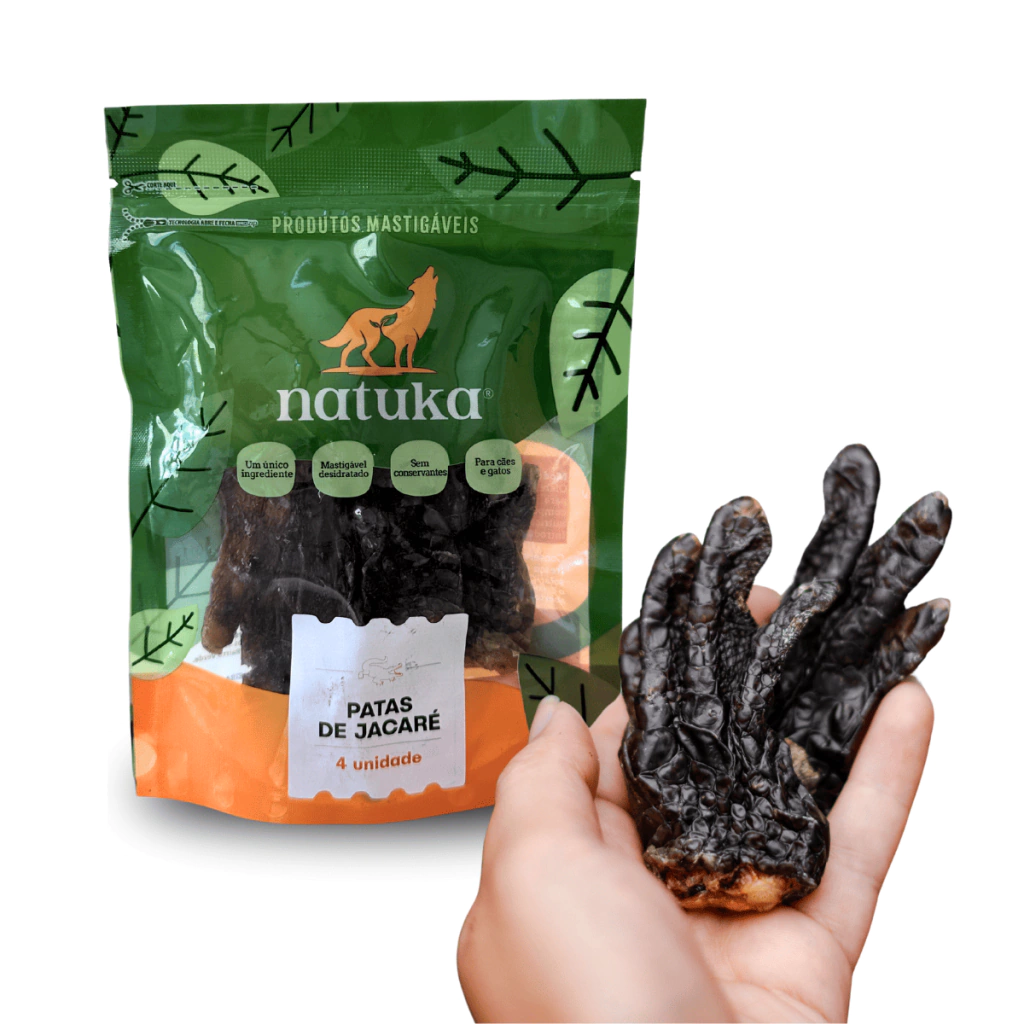 1x Mordedor Natural Pata de Jacaré Natuka 4un → Rico em colágeno, contribui para articulações saudáveis e higiene bucal.