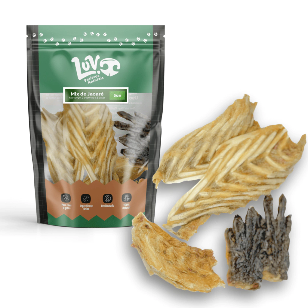 1x Mordedor Natural Patas de Jacaré 100g Luv → Hipoalergênico, reforça músculos e imunidade.