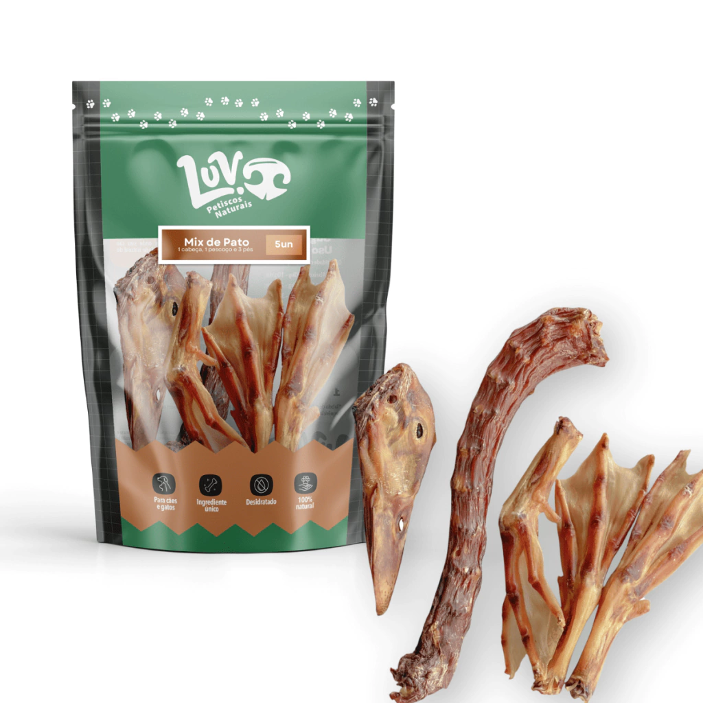 1x Mordedor Natural Mix de Pato Luv 5un → Cabeça, pescoço e pés para mastigação intensa e saúde dental.