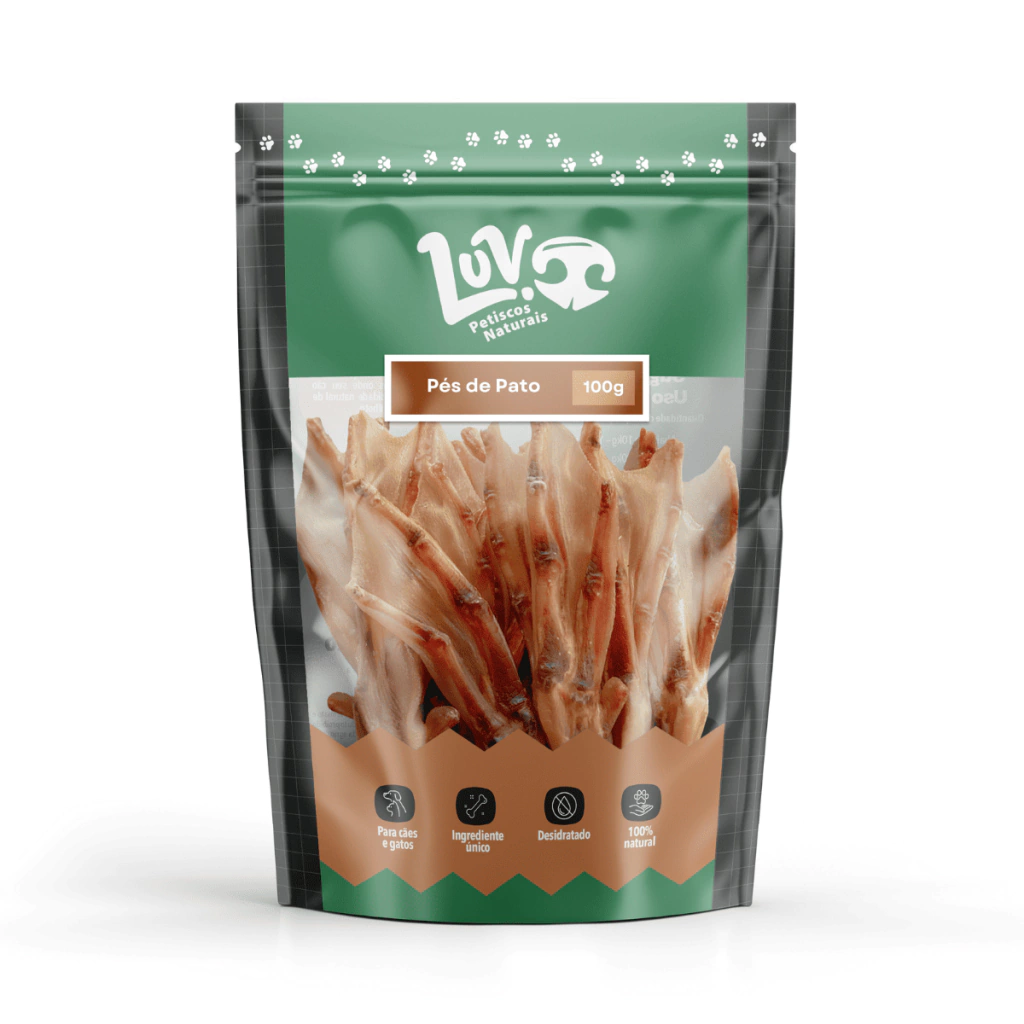 1x Mordedor Natural Pés de Pato 100g Luv → Promove a mastigação natural, satisfazendo o instinto dos cães.