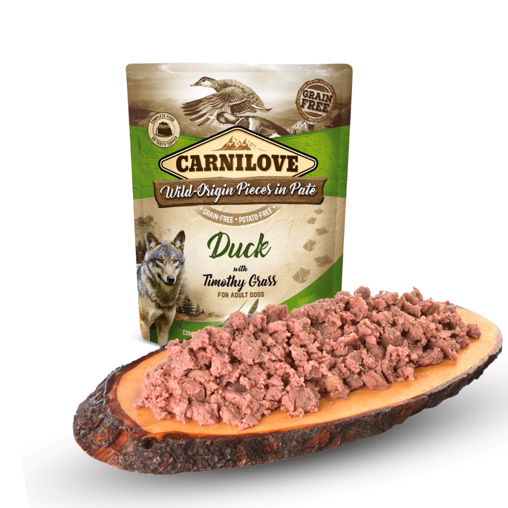 1x Patê Natural Pato com Timothy Grass Carnilove 300g → Proteínas hipoalergênicas e fibras naturais para digestão saudável.
