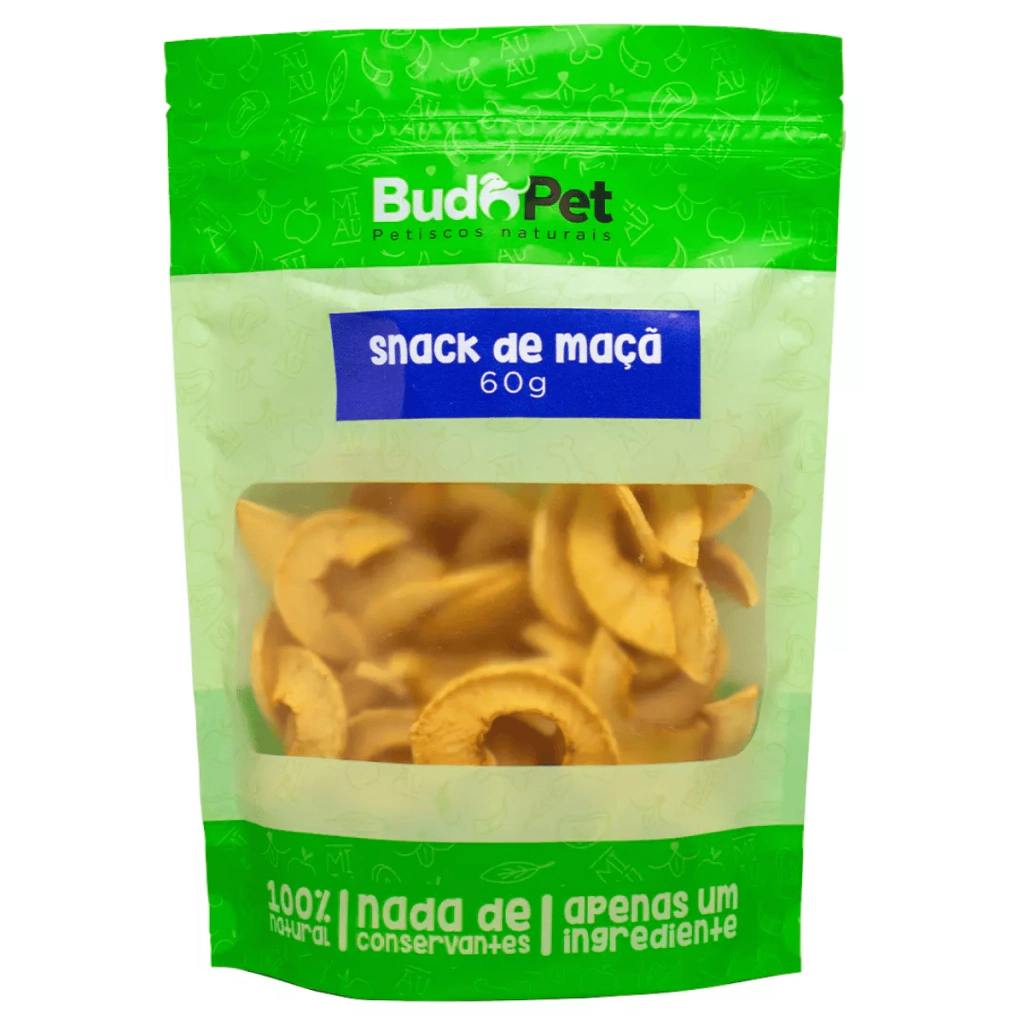 1) Petisco Natural Snack Maçã 80g BudoPet – Alternativa livre de proteínas animais, ideal para cães alérgicos.