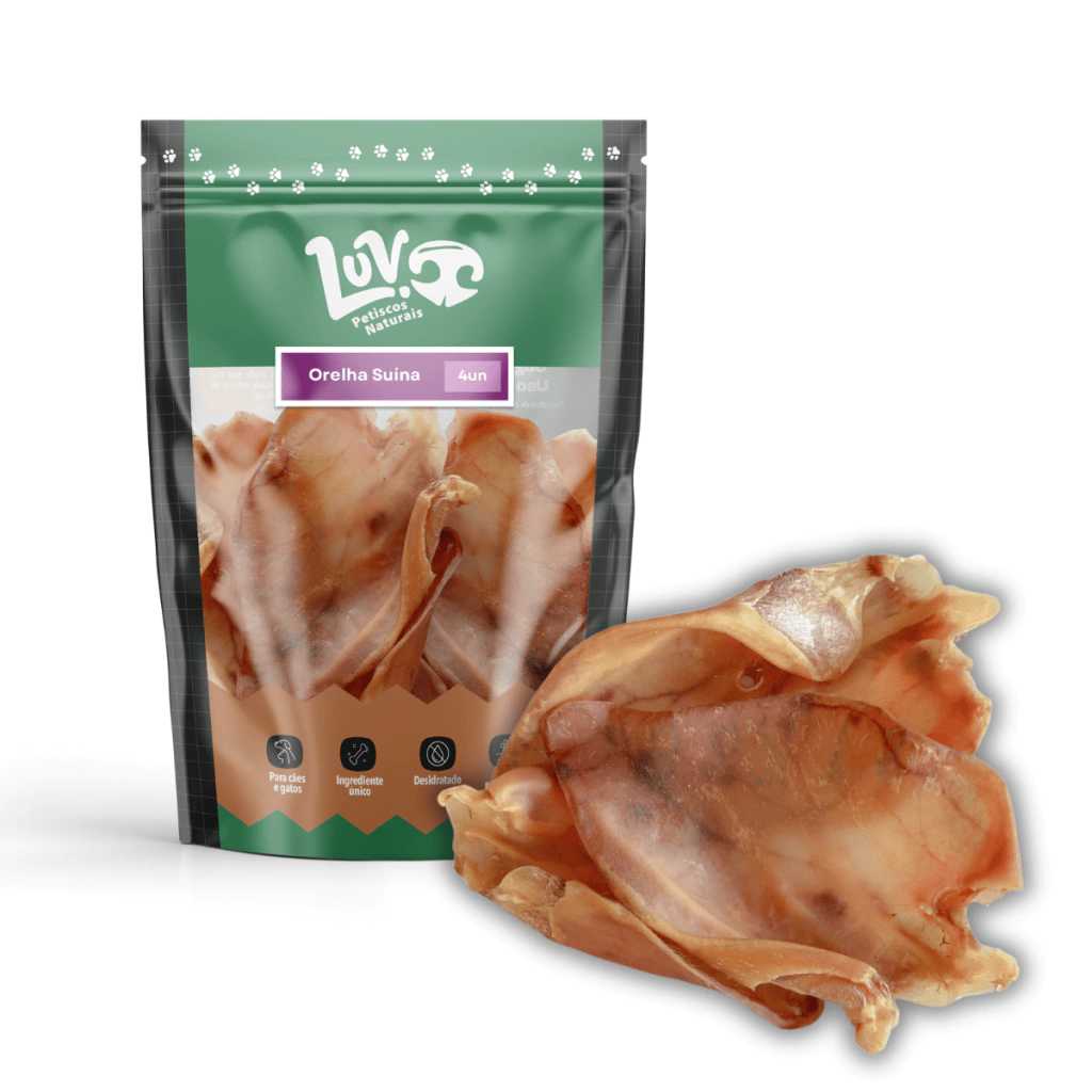 1x Orelha Suína Luv 4un → Snack leve que estimula a mastigação e reduz o estresse.