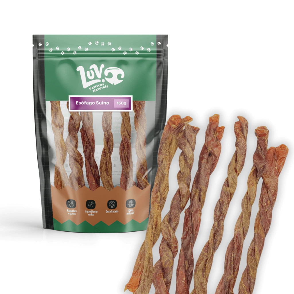 1x Mordedor Esôfago Suíno Luv 150g → Textura macia, perfeito para mordida delicada.