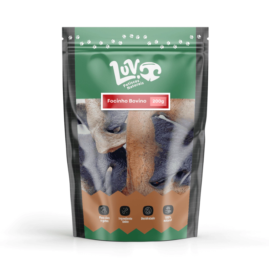 O Focinho de Bovino Luv é um mastigável natural de rigidez moderada, indicado para cães de porte médio e grande que adoram roer. Produzido a partir do nariz e bochechas do boi, ele oferece uma experiência de mastigação prolongada, ajudando a entreter o pet e a satisfazer seu instinto natural de roer.