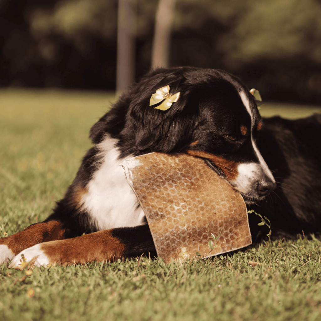 Ideal para oferecer em ambientes externos, pois ao entrar em contato com a saliva, pode exalar um odor natural característico da pele bovina — sinal da pureza do produto.