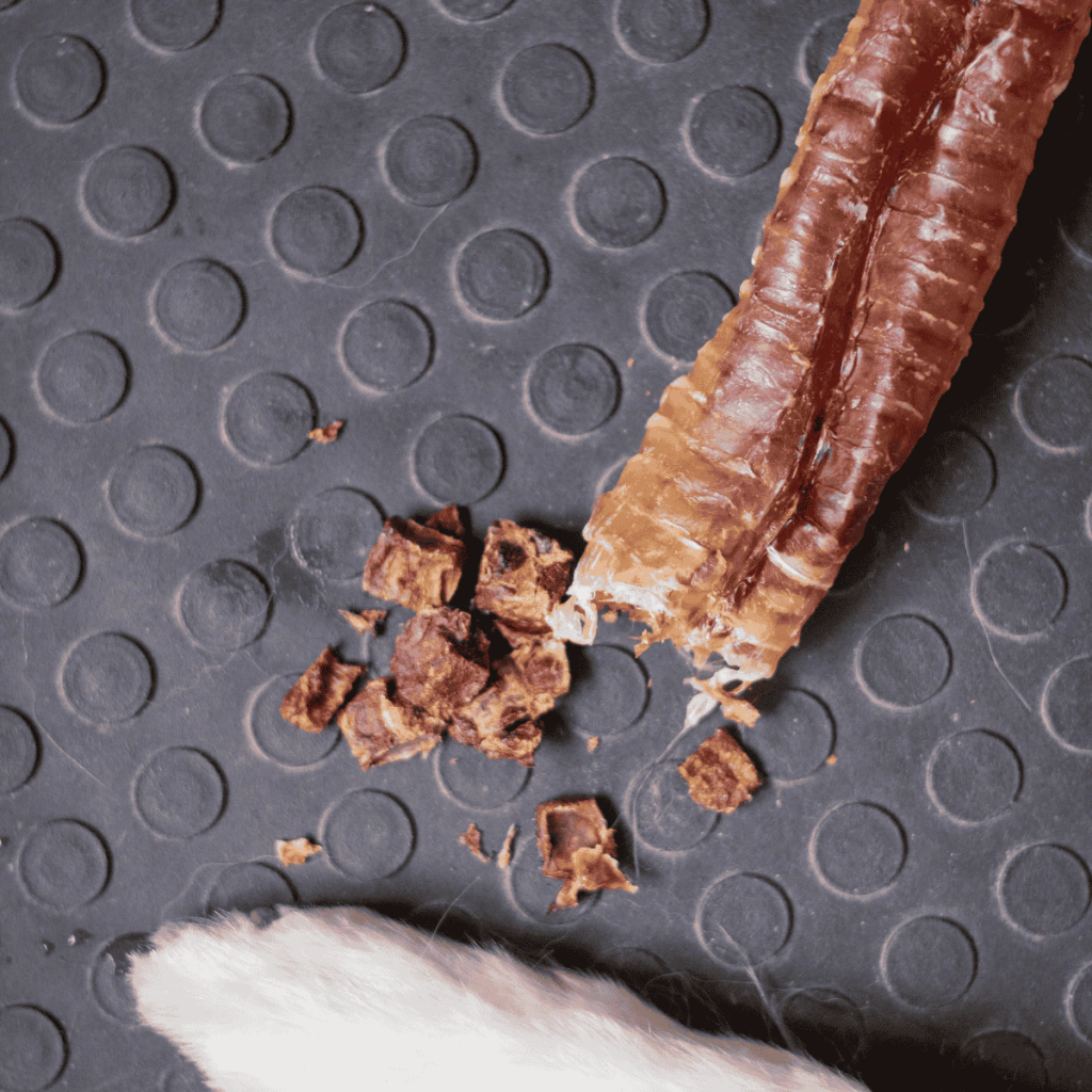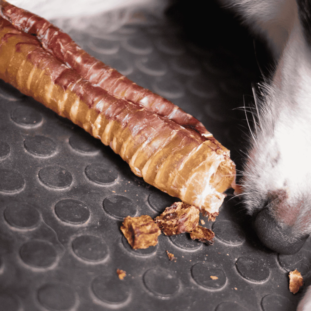 Seu formato em rolo ativa o instinto de caça, incentivando o cão a remover o recheio antes de continuar a mastigação da traqueia — uma atividade que estimula o foco e proporciona enriquecimento ambiental de forma natural e segura.