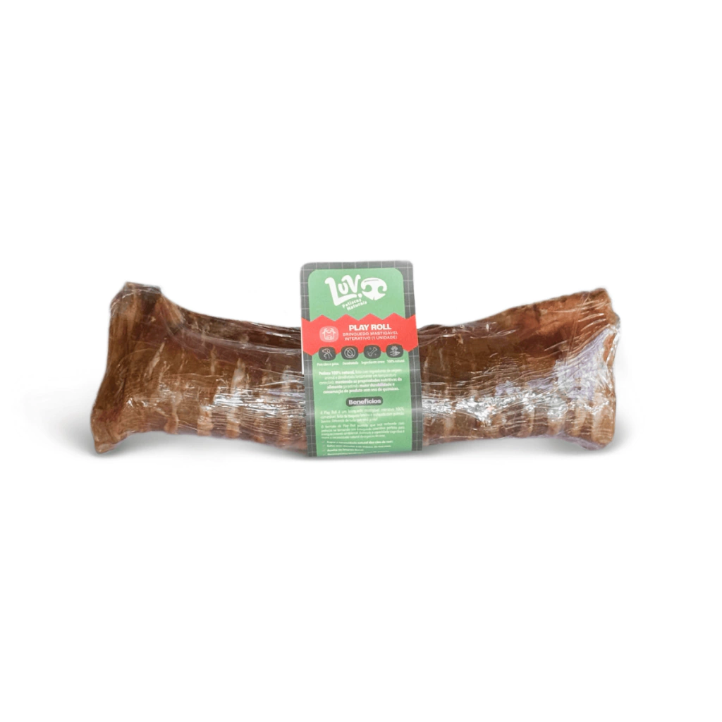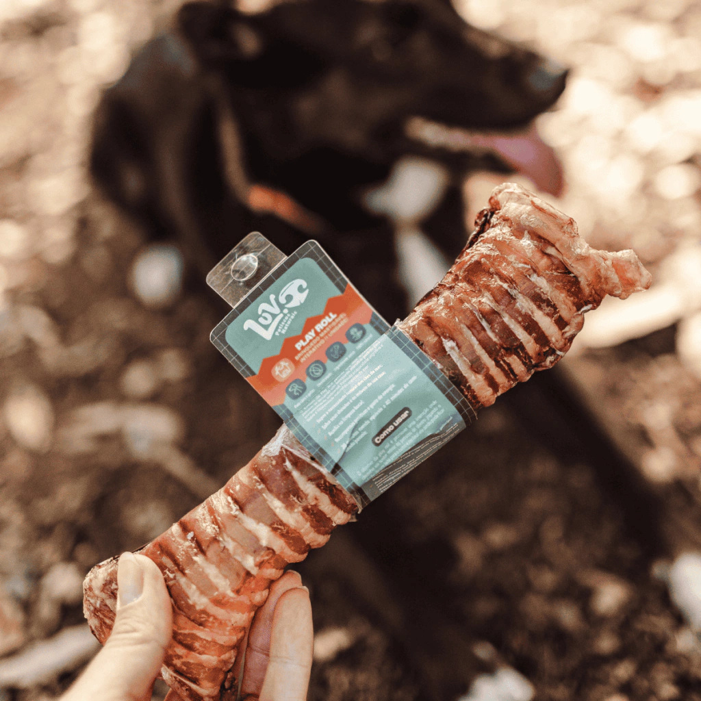 O Play Roll da Luv é um mordedor comestível e 100% natural, composto por traqueia bovina desidratada recheada com pulmão bovino. Com cerca de 20 cm de comprimento e 10g de recheio, promove estímulo físico, mental e sensorial, sendo ideal para cães que amam desafios e novas texturas.