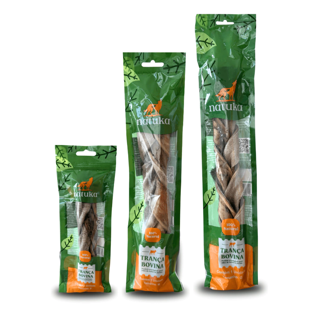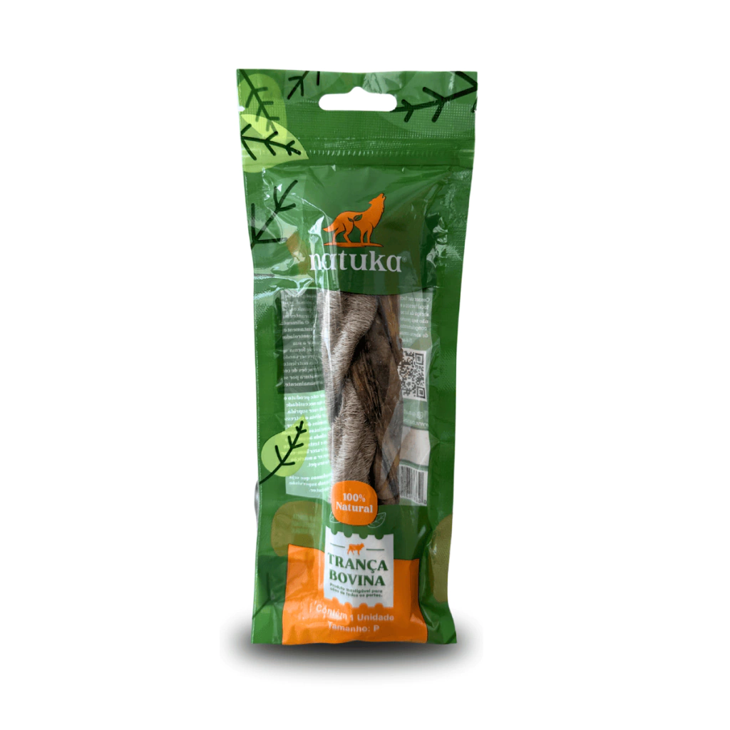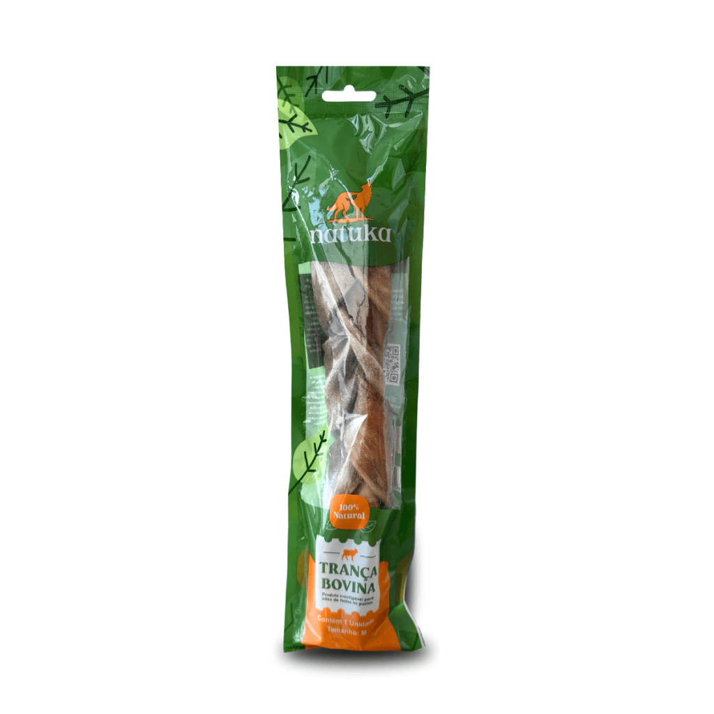O Mordedor Natural Trança Bovina Natuka é uma opção extremamente resistente e saudável, feita com 100% couro bovino trançado e desidratado naturalmente. Seu formato trançado proporciona durabilidade extra, tornando-o ideal para cães que adoram roer. Além disso, contém pelos naturais, que são altamente benéficos para a saúde gastrointestinal dos cães.