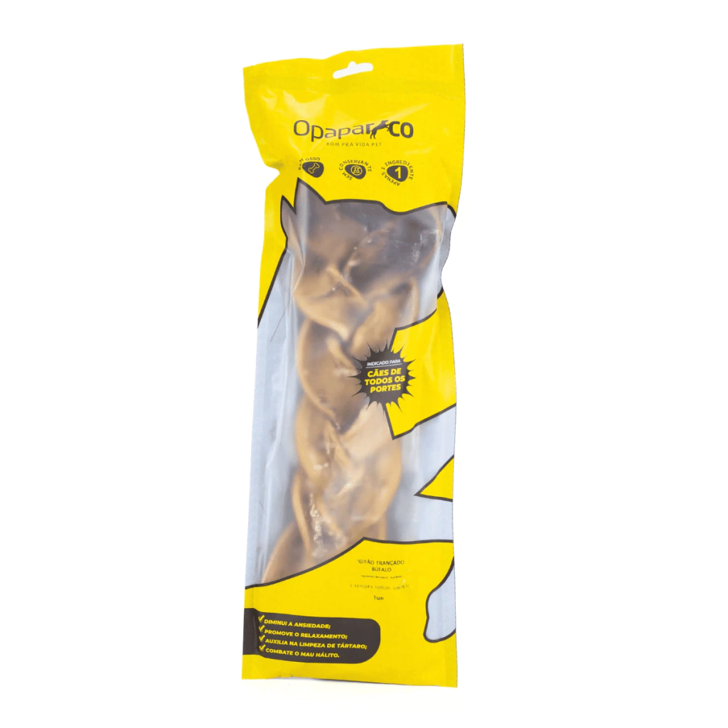 O Trançado de Búfalo da Opaparico é um mordedor natural de aproximadamente 40 cm, feito com pele de búfalo desidratada, indicado para cães de porte médio e grande com mordida pesada. A estrutura trançada aumenta a durabilidade e proporciona mais desafio na mastigação, o que gera maior gasto de energia física e mental.