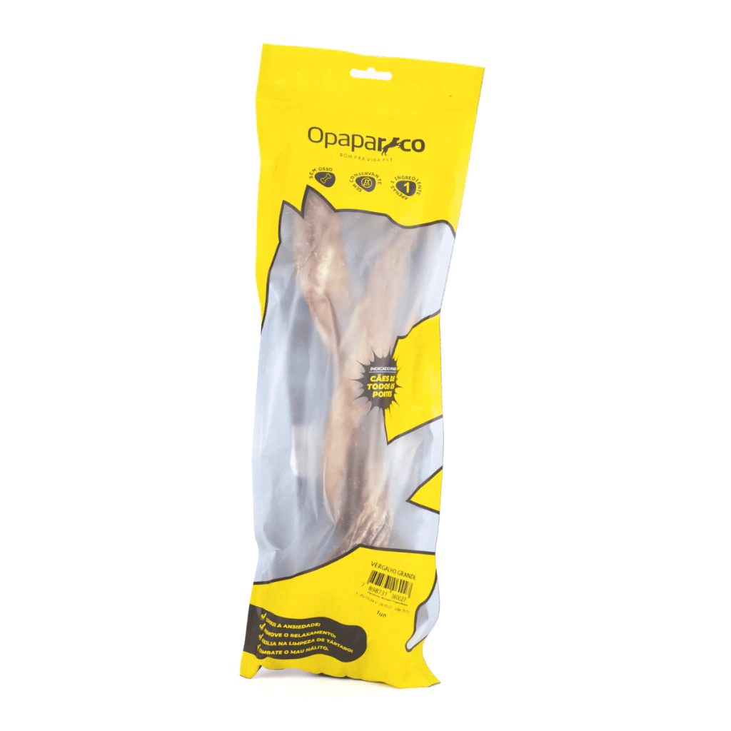 O Vergalhão Bovino Grande da Opaparico é um mordedor natural de aproximadamente 40 cm, feito com vergalho bovino desidratado, ideal para cães de porte médio e grande com mordida pesada. Por ser naturalmente firme e saboroso, proporciona uma mastigação duradoura e satisfatória, enquanto contribui para a saúde bucal e o equilíbrio emocional do seu cão.
